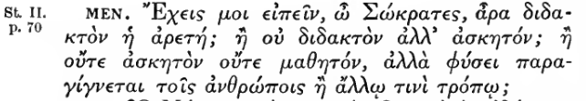 “Oh Socrates, is excellence a teacher, able to speak1 to me? Not as a teacher but as an ascetic? … neither as an ascetic nor as a pupil, but of a man’s form, concerning the coming into being of men’s characters?”